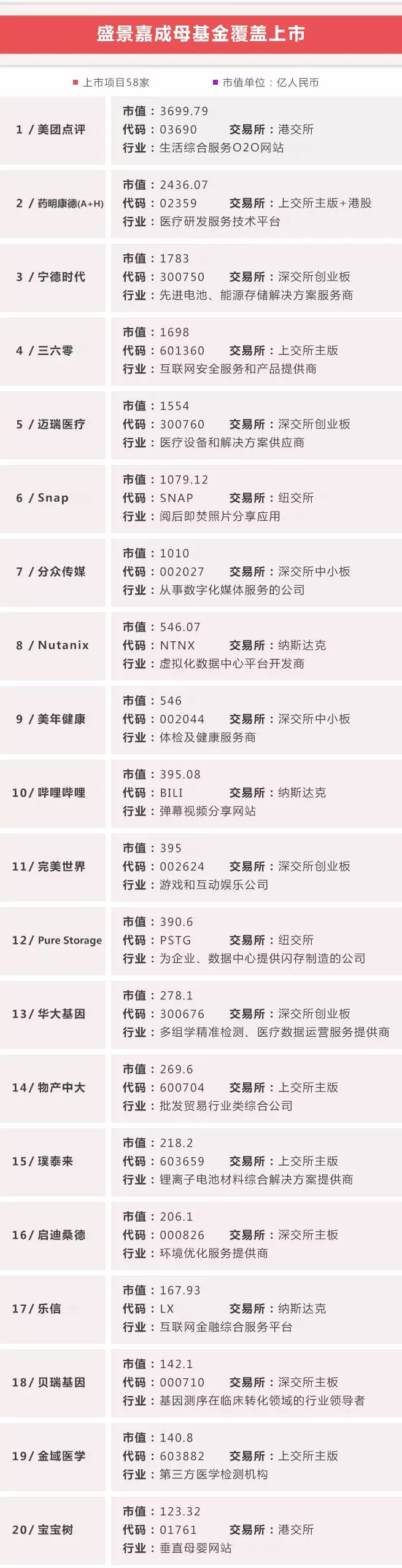 截至目前,2019年盛景嘉成直投及母基金覆盖项目中,已有6个项目成功上市、70个项目获融资(详见每周投资喜报),至此共有58个投资覆盖项目成功上市。