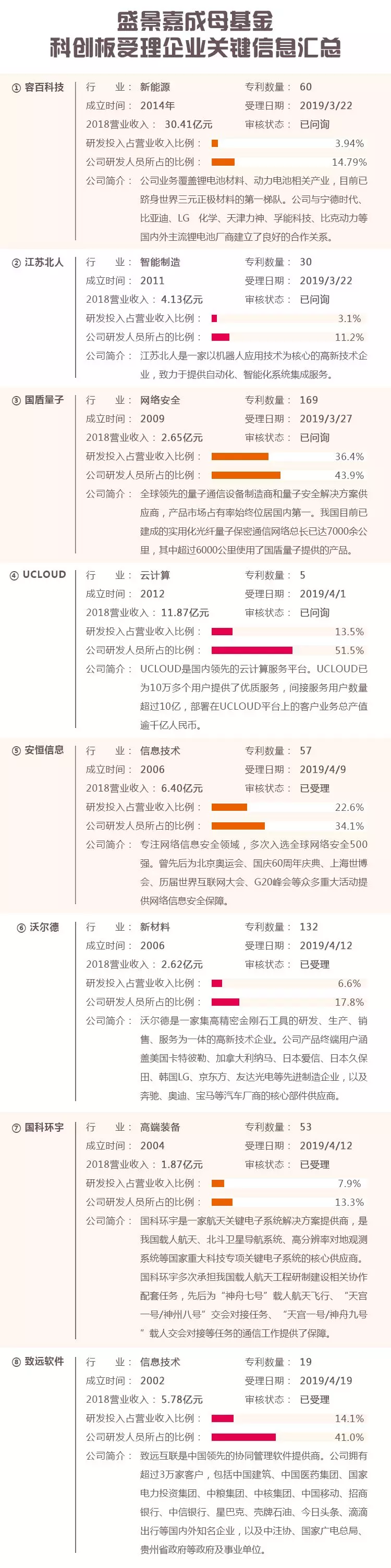 (盛景母基金对17家A股排队企业具体投资覆盖情况详见附表表二) 围绕着“创新、创业、创意”,盛景嘉成母基金几乎连接了所有一线股权投资机构以及著名的投资服务机构,通过与顶级投资机构合作,完成全球化资产配置,盛景嘉成有效覆盖了包括中国、美国、以色列等全球创新高地在内的股权投资发达市场。 目前,盛景嘉成母基金已成为本土领先的最大的企业家母基金股权投资平台,也是中国唯一一家在全球专注创新投资的市场化股权母基金平台。 在未来的道路上,盛景嘉成会与所有朋友一同前行。让下一代BAT为中国投资者创造财富,让全球最佳管理人为中国投资者创造财富,让中国投资者连接全球创新,共同改变世界! 8家科创板受理企业盛景嘉成母基金覆盖情况汇总(表一) 1.容百科技 项目所涉盛景嘉成母基金:综合十九期 投资时段:2018年03月 2.江苏北人 项目所涉盛景嘉成母基金:综合二期 投资时段:2015年09月 3.国盾量子 项目所涉盛景嘉成母基金:君联资本专项、综合七期 投资时段:2016年02月 4.UCLOUD 项目所涉盛景嘉成母基金:龙腾回归2期、综合十一期 投资时段:2016年06月 5.安恒信息 项目所涉盛景嘉成母基金:综合十六期 投资时段:2017年09月 6.沃尔德 项目所涉盛景嘉成母基金:华创盛景-成长I期 7.国科环宇 项目所涉盛景嘉成母基金:达晨专项 投资时段:2015年12月 8.致远软件 项目所涉盛景嘉成母基金:大奖一期、汉能专项 投资时段:2017年01月 17家A股排队企业盛景嘉成母基金覆盖情况汇总(表二) 01 企业介绍:确成硅化学股份有限公司主要从事沉淀法白炭黑产品的研发、制造和销售。公司主要产品为沉淀法白炭黑,包括橡胶工业用白炭黑、饲料添加剂二氧化硅、口腔护理用二氧化硅。 受理日期:2017年07月 项目所涉盛景嘉成母基金:综合十七期 投资时段:2016年01月 02 企业介绍:国茂减速机是一家专业生产国茂减速机、常州国茂减速机,电机的综合型国家级民营企业集团,创建于1993年,总部位于常州市武进国家高新区西湖路111号。 受理日期:2017年07月 项目所涉盛景嘉成母基金:综合二期 投资时段:2016年12月 03 企业介绍:百洋医药是一家专注于健康产业投资和运营的企业集团,主要投资健康品牌、企业股权及健康产业相关物业,专注于发展涵盖国际品牌生态圈、互联网应用生态圈、健康服务生态圈、金融服务生态圈于一体的健康产业资源优化平台。 受理日期:2018年04月 项目所涉盛景嘉成母基金:综合十期、君联资本专项 投资时段:2015年09月、2015年10月 04 企业介绍:良品铺子是一家集休闲食品研发、加工分装、零售服务的专业品牌连锁运营公司。 受理日期:2018年06月 项目所涉盛景嘉成母基金:高瓴专项、高瓴资本专项 投资时段:2017年09月、2017年08月 05 企业介绍:公牛集团是一家硬件领域的企业,主要从事开关、插座、转换器等电源连接硬件及相关电工硬件的研发和生产。致力于以创新科技、智能产品为消费者提供安全可靠的电源连接解决方案,优化消费者的用电环境。 受理日期:2018年09月 项目所涉盛景嘉成母基金:高瓴专项 投资时段:2017年12月 06 企业介绍:上海罗曼照明科技股份有限公司于2014年3月5日在全国中小企业股份转让系统挂牌并公开转让。具有上海住房与城乡建设委员会审批核发的“城市及道路照明工程专业承包一级”施工资质、国家住房与城乡建设部颁发的“照明工程设计专项甲级”资质,成为照明工程领域为数不多的具备“双甲”资质的企业。 受理日期:2018年12月 项目所涉盛景嘉成母基金:新三板母基金, 综合十八期 投资时段:2017年06月 07 企业介绍:无锡新洁能股份是一家大功率半导体器件的领航设计与销售企业,专业从事各种大功率半导体器件与功率集成器件设计、生产和销售,功率半导体器件将是未来汽车电动化、智能化的重要元器件。是中国大功率半导体器件子行业的龙头企业。 受理日期:2018年12月 项目所涉盛景嘉成母基金:综合二期 投资时段:2017年03月 08 企业介绍:ATA(全美在线)致力于通过评价和数据创造人和学习,人和职业的链接,构建每个人的才智发展图谱,为人才成长提供个性化解决方案,实现人才与雇主之间,人才与职业发展之间高效、精准的匹配;为行业、企业的人力资源管理和发展提供平台化的服务。 受理日期:2018年12月 项目所涉盛景嘉成母基金:高瓴专项 投资时段:2018年06月 09 企业介绍:东鹏控股始创于1972年,是行业整体家居一站式服务供应商,拥有瓷砖、洁具、木地板、涂料、家居用品等业务,致力于向消费者提供舒适的空间解决方案、高品质的产品配置和人性化的真情服务。 受理日期:2017年09月 项目所涉盛景嘉成母基金:综合十期 投资时段:2016年04月 10 企业介绍:深圳科瑞技术股份有限公司于2001年在中国深圳成立,至今已积累17年行业经验。深圳科瑞技术股份有限公司是一家以科技为本,具有先进的设计、研发、加工制造、项目管理和服务一体化的工业自动化企业。 受理日期:2017年12月 项目所涉盛景嘉成母基金:综合十一期、龙腾回归二期 投资时段:2016年11月 11 企业介绍:甘源食品股份有限公司成立于2006年,是集生产、研发、销售为一体的专业生产豆类和果仁类的休闲食品企业。 受理日期:2019年04月 项目所涉盛景嘉成母基金:综合十期 投资时段:2015年11月 12 企业介绍:新产业生物是一家专业从事研发、生产、销售“